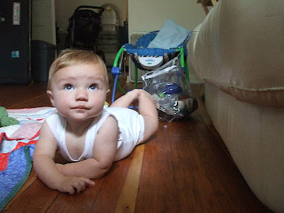 At 11:27AM PST, May 29 2008, North rolled over on his own know-how and strength for the first time ever. I watched and encouraged him when he was halfway there and having trouble getting one arm out of his way from fully coming over onto his stomach. He started to get discouraged, and I praised him and he smiled and then started grunting and trying harder. He made it.